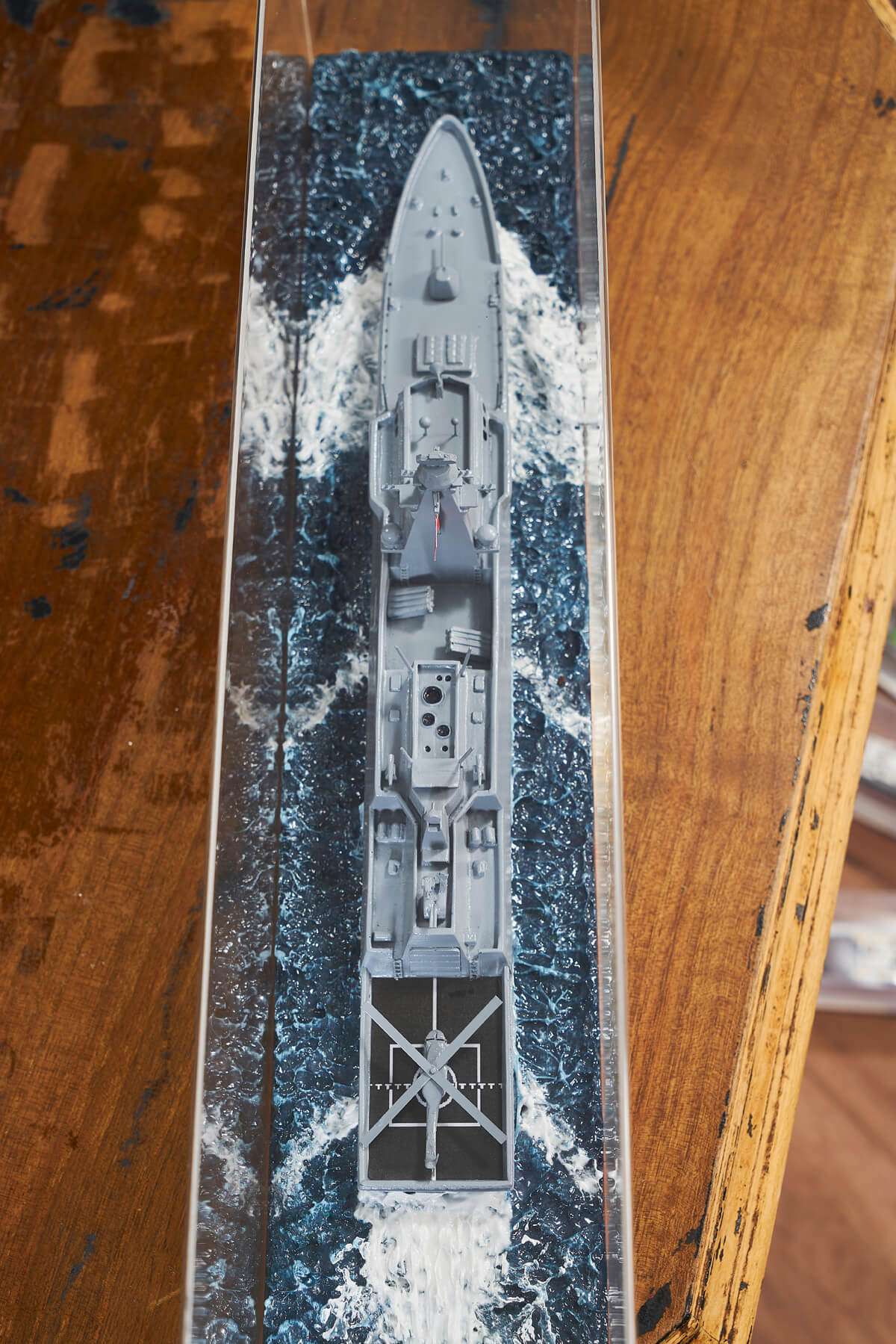 The helicopter warship model designed for sea enthusiasts is one of the most eye-catching items of the model collection. The helicopter warship model was prepared with a wooden sub-frame plastic box. The model of warship with helicopter reflects the model works integrated with the sea. The helicopter warship model, designed on waves, is a model ship with every detail elaborated. The waves are inspired by their true form and are crafted in white and blue hues. Every detail of the helicopter warship has been meticulously made. It is resistant to external factors thanks to its special transparent box. The helicopter warship designed on the waves is a special model work for those who have a model collection. The warship model with helicopter is also a unique product as a gift. You can add a different atmosphere to the space with the model, which is very useful for home decoration and office decoration. The helicopter warship model will also be included in a special section of the model collection for beginners. The helicopter warship model, which has a gray color, is a special handmade product that integrates with the waves in blue tones. You can find models of ships prepared for sea lovers on Nautica Goods.