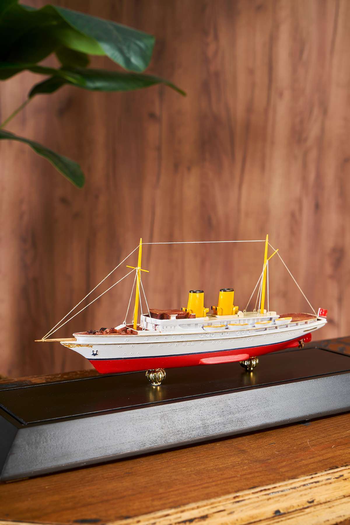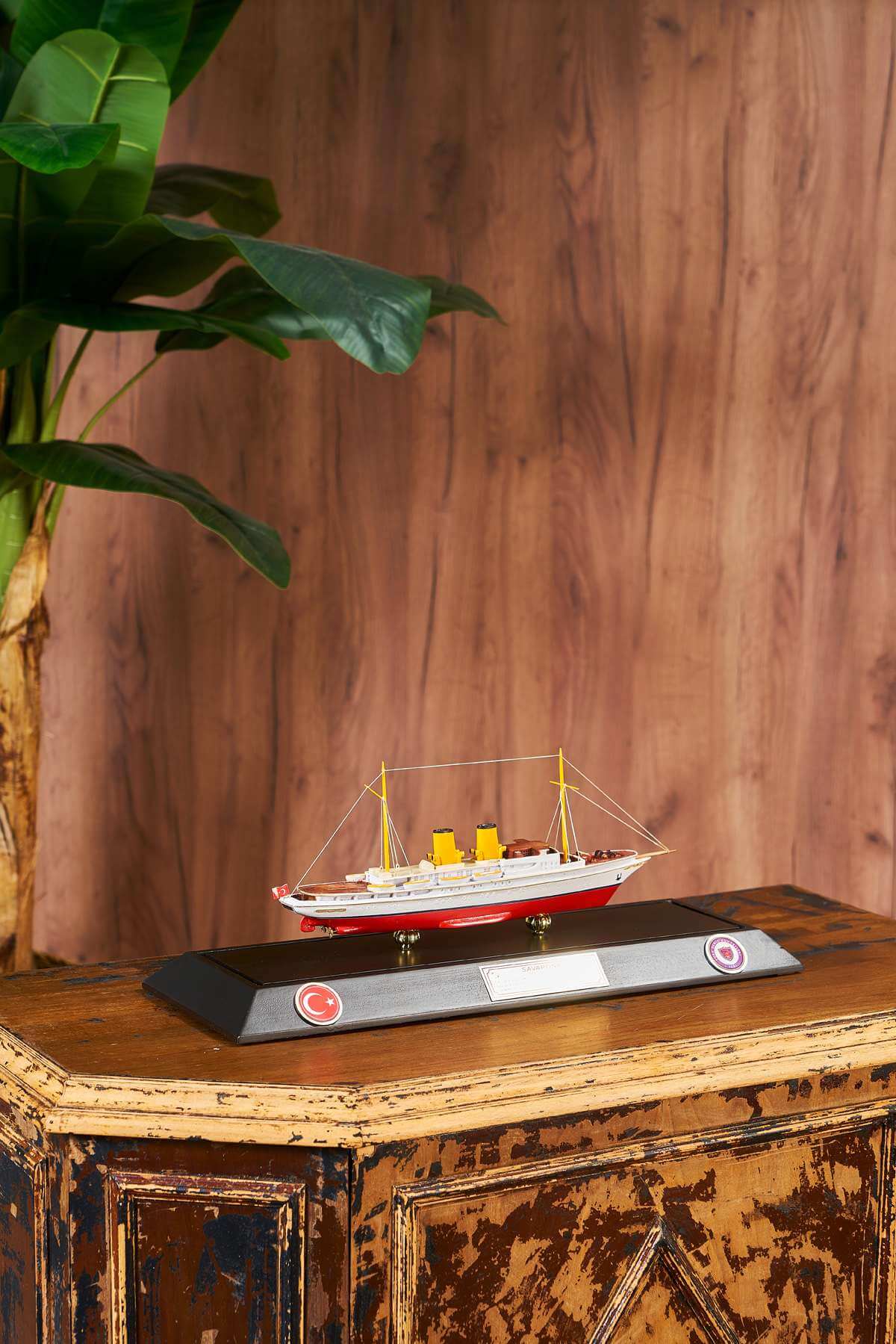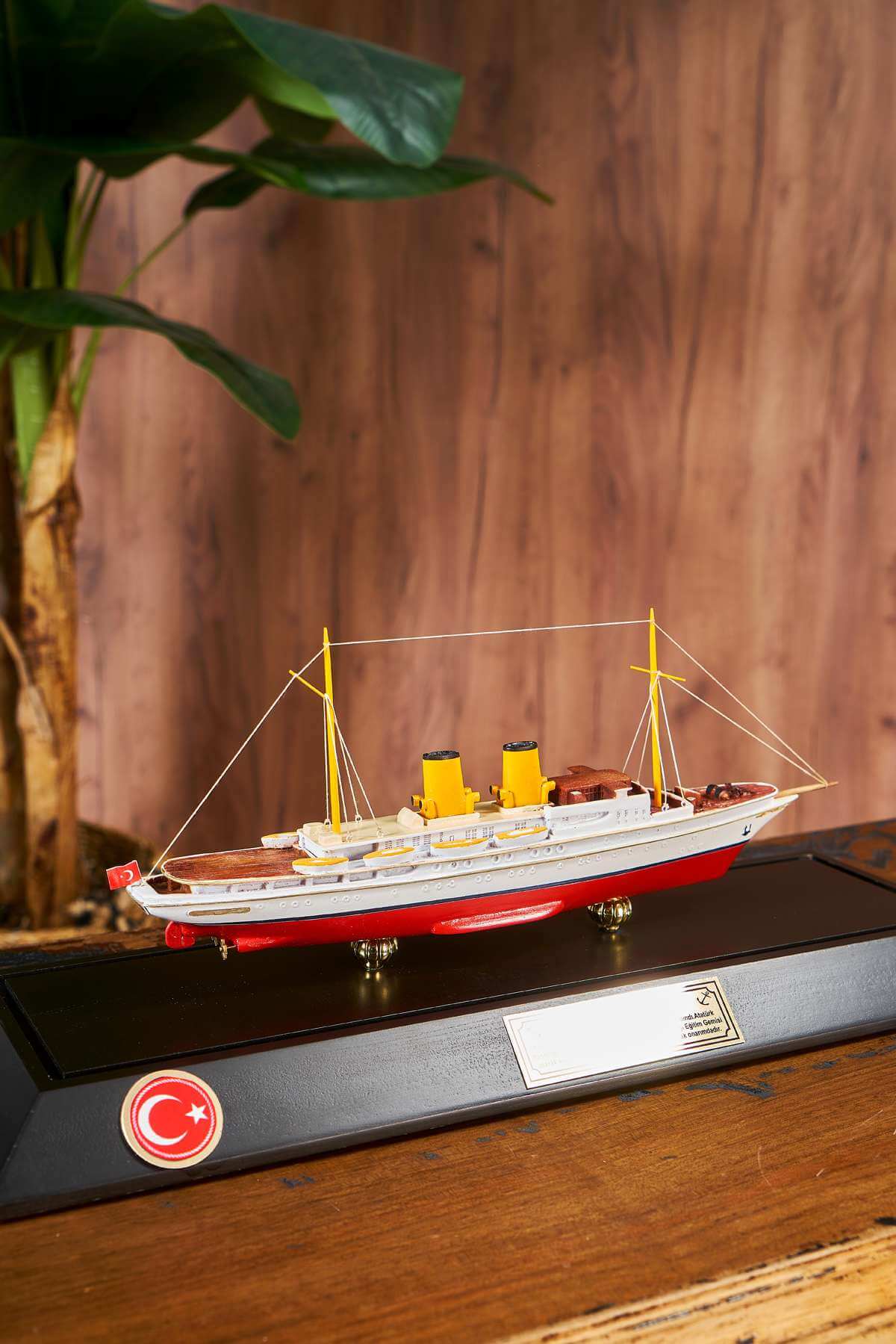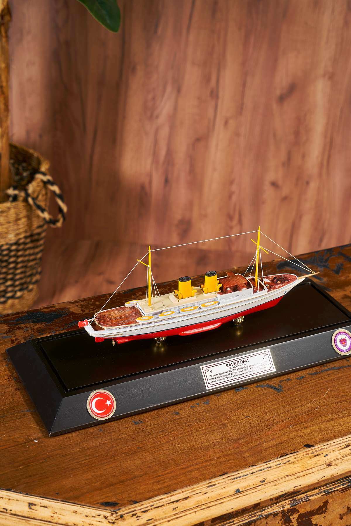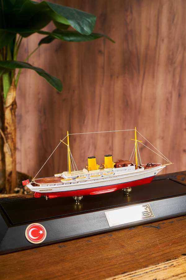 Savarona takes its name from an African swan living in the Indian Ocean. The Savarona ship was designed in 1931. It was given as a gift to Mustafa Kemal Atatürk by the Turkish government on February 23, 1938. Mustafa Kemal Atatürk spent 54 days on board. Savarona ship, which has an important place in our history, has a special place in model collections with its model. The Savarona ship model made of wooden material is prepared with a plastic box with a wooden bottom frame. The Savarona ship model takes an important place among the model works. The Savarona ship is a model ship work of which every detail is elaborated and elaborated. The model ship, inspired by its real form, is prepared in white and red color tones.