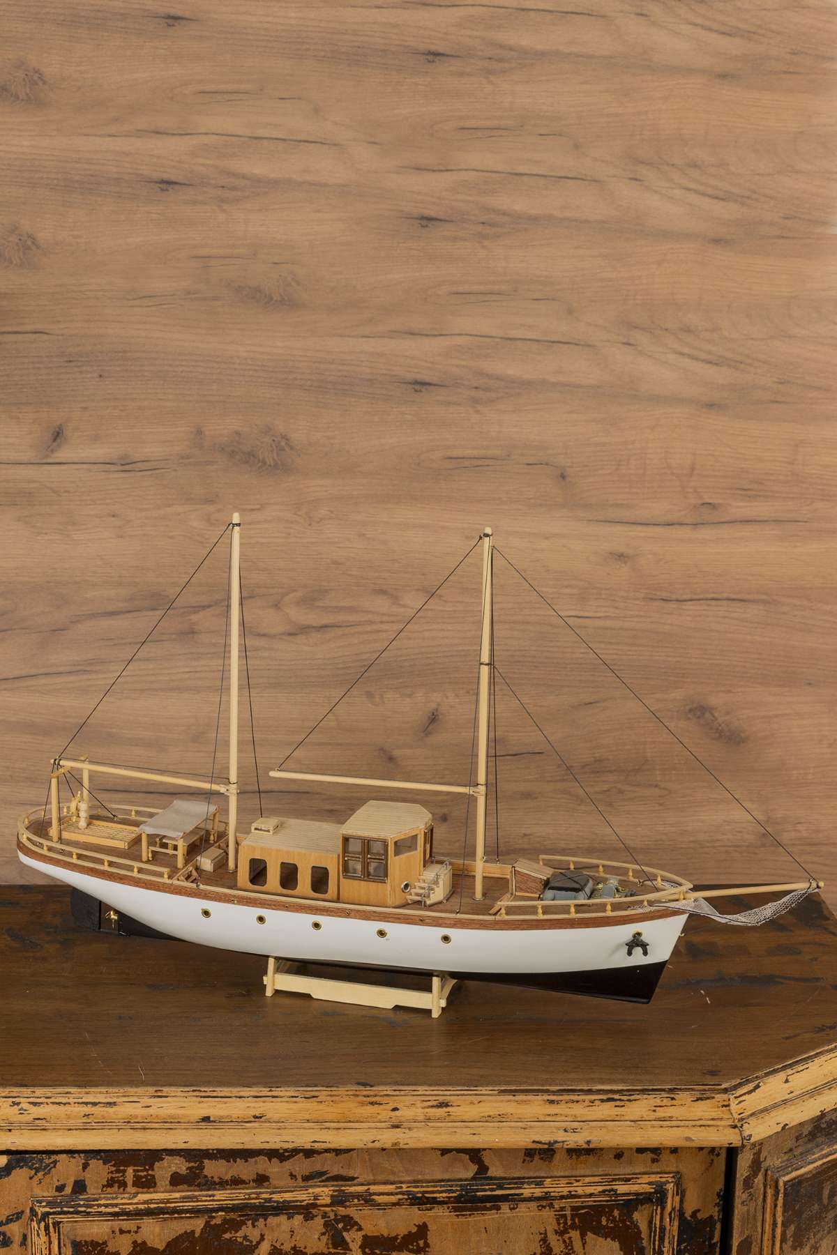 Wooden Sailing Yacht Model prepared with wooden materials has color transitions in brown, white and yellow tones.
